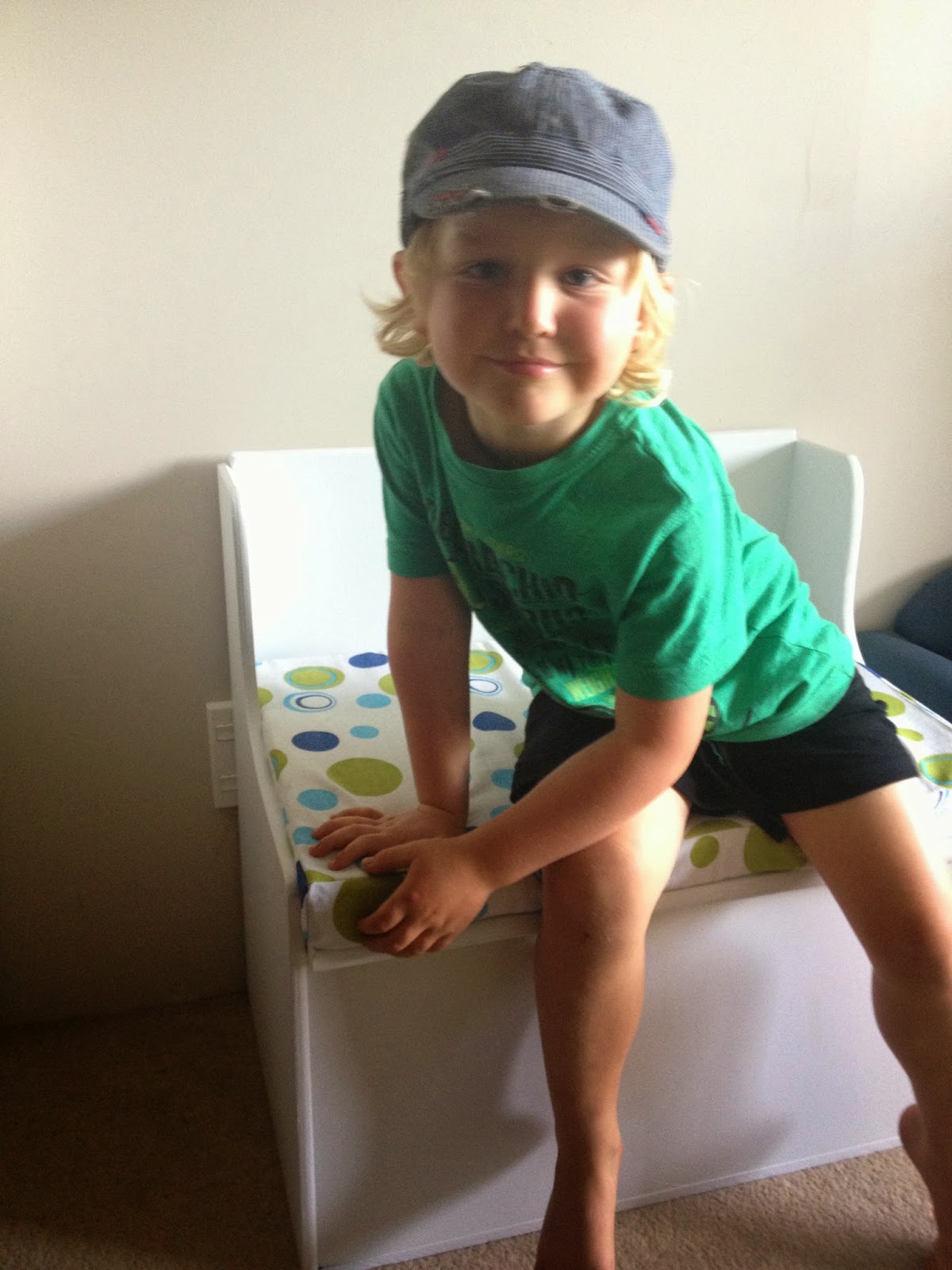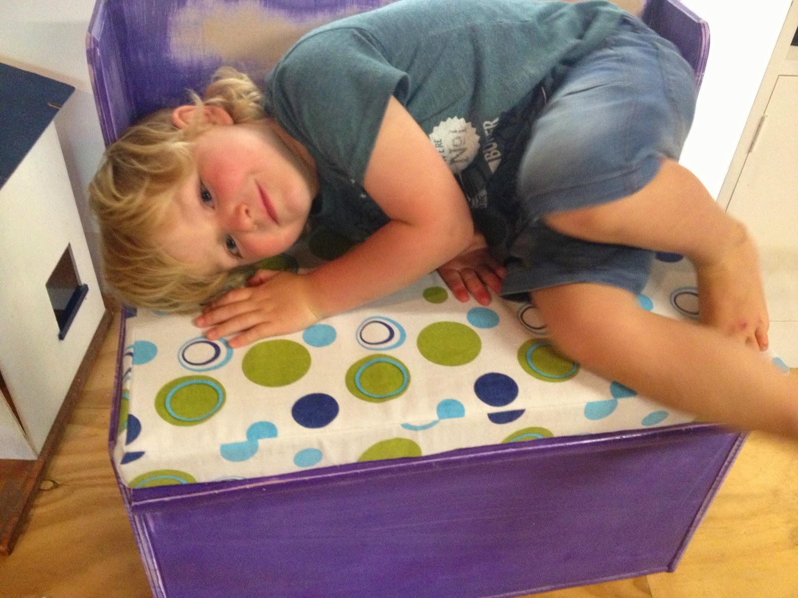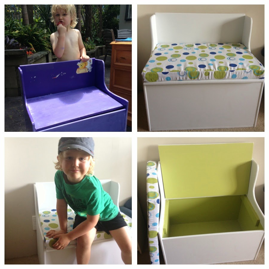 I took Kylan up to the school fair and stumbled across the coolest toy box that doubled as a seat. It was purple and covered in stickers but I could just see the potential AND it was only $10… $10!!!!