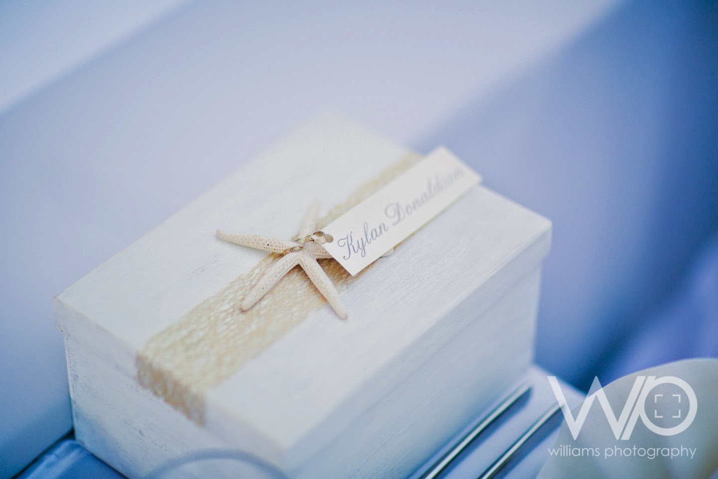 We chose to have our reception on the North deck of Mana Island with lots of lights and lanterns and a large dance floor. The theme of white and gold was carried through with special little touches. I thought long and hard for months and months about the favours we would give our guests. We wanted to give them something special that they would keep and use. We decided on luggage tags which we put a little thank you note inside wishing them safe travels. I put these in little boxes with a white starfish and name tag on top which doubled as their name cards. Kylan had his very own special box filled with fun little activities to keep him happy all night long.