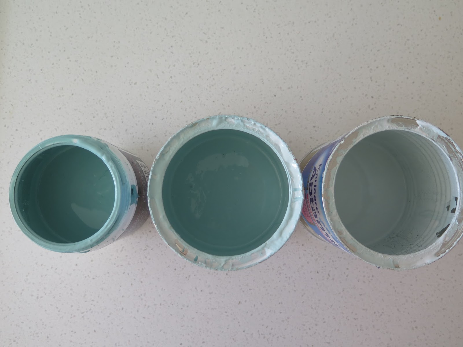 Here is where I made my first mistake. So you have probably guessed that to get the darker shades you just keep adding a bit more blue to the previous colour to get a slightly darker shade. What I did was keep adding to the same pot. Big mistake! If you accidentally add a bit too much blue you have a real mission on your hands to try get back to a lighter shade. I found this out the hard way when I accidentally jumped to a way darker shade where it looked funny and it took me forever to try re mix my colours to get the correct colour. Once I did this once I realized that I needed to keep some of each of the previous colour used. I had lots of formula tins lying around which were perfect to use. So I would pour half of the colour just used into a tin and put it aside, then add a hint of blue to the other half of it to create my next colour and so on and so on.